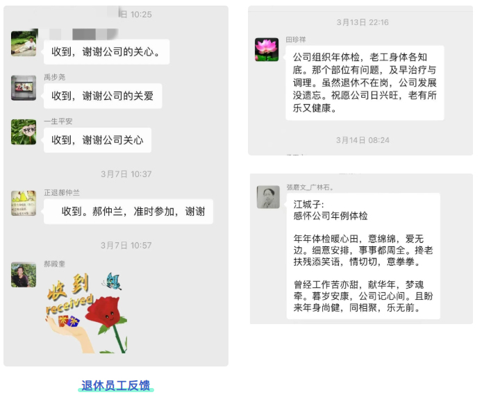 尊重老员工、关爱老员工,是企业义不容辞的责任。一直以来,公司始终高度重视退休员工关爱工作,将年度健康体检作为重要抓手,开展重阳节敬老活动,搭建交流平台,及时了解退休员工生活状况,让退休员工共享企业发展成果,安享幸福生活。
