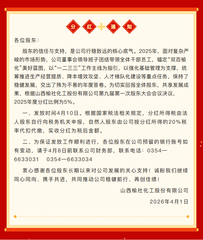 山西榆社化工股份有限公司关于2025年度股东分红的通知